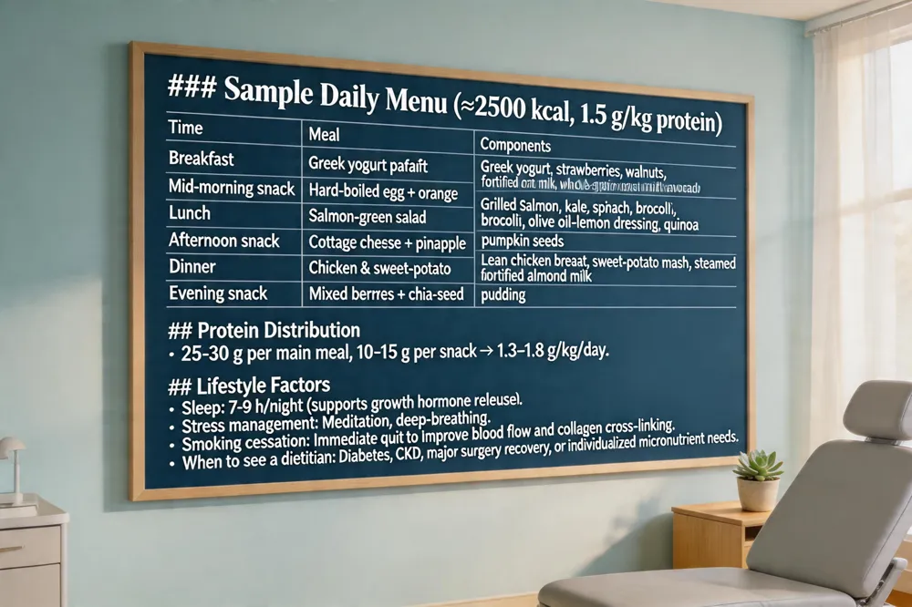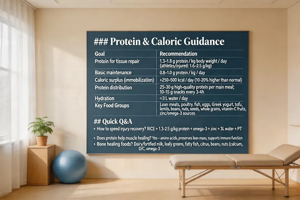 Overall protein intake recommendations – Aim for 0.8‑1.0 g protein / kg body weight / day for basic maintenance, increasing to the therapeutic range above during recovery. Pair protein with modest carbohydrates (whole grains, sweet potatoes) for sustained energy and with vitamin‑C‑rich fruits/vegetables, zinc‑rich foods, and omega‑3 sources (salmon, walnuts, chia) to support collagen formation, reduce inflammation, and improve circulation. Adequate hydration (≈3 L water/day) also supports recovery.