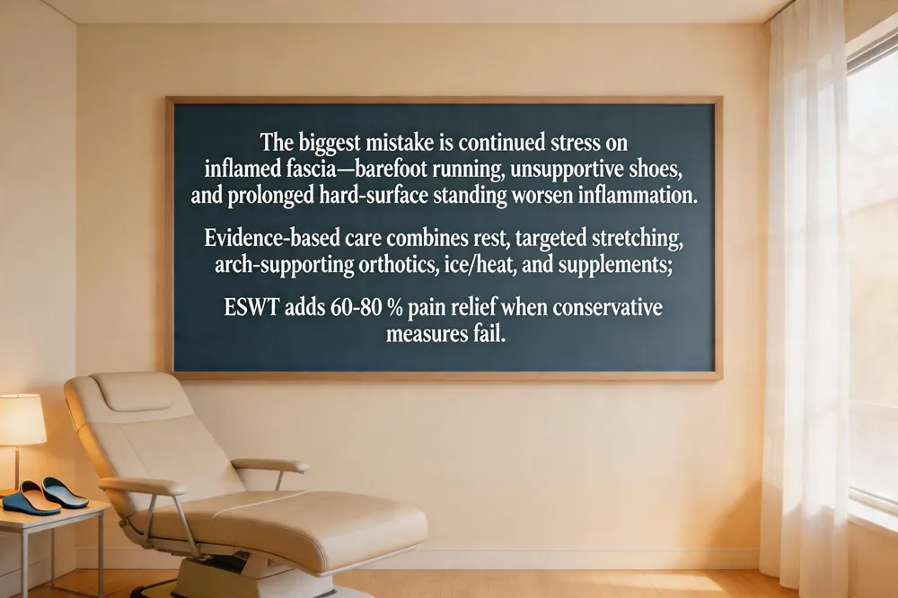 Evidence‑based treatment components that lead to recovery Successful programs combine rest, targeted stretching (calf‑gastrocnemius and plantar fascia), orthotics that provide firm arch support and a slight heel lift, and modality support such as ice, heat, and omega‑3/collagen supplementation. When conservative care fails, extracorporeal shockwave therapy (ESWT) offers a non‑invasive option: 3‑5 sessions of 15‑20 minutes each have shown 60‑80 % pain reduction and functional improvement within 6‑12 weeks (clinical studies and patient registries). Shockwave therapy promotes neovascularization, collagen remodeling, and analgesia, allowing many patients to avoid surgery.