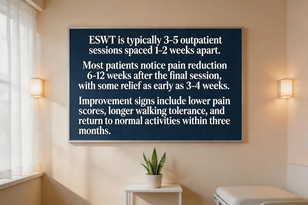 Shockwave therapy (ESWT) is typically delivered in a series of three to five outpatient sessions, each spaced one to two weeks apart. Most patients begin to notice a reduction in foot pain between six and twelve weeks after the final treatment, with some experiencing relief as early as three to four weeks. The timeline can vary by condition—plantar fasciitis, Achilles tendinopathy, or heel spurs—and by individual healing rates, but meaningful improvement is usually evident within three months.