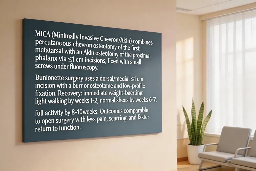 Minimally invasive bunion surgery has become a preferred option for correcting hallux valgus while preserving soft‑tissue integrity. What is the MICA technique? MICA (Minimally Invasive Chevron / Akin) combines a percutaneous chevron osteotomy of the first metatarsal with an Akin osteotomy of the proximal phalanx, using 1‑cm or smaller incisions. Guide wires and specialized burrs under fluoroscopic guidance cut and realign the bones, which are then fixed with small screws. This approach minimizes scarring, reduces postoperative pain, and often allows immediate weight‑bearing, with most patients returning to normal shoes within weeks. How is a minimally invasive bunionette (tailor’s bunion) surgery performed? A dorsal or medial incision under 1 cm is made over the fifth metatarsal head. A percutaneous burr or osteotome creates a precise osteotomy, and the fragment is stabilized with a low‑profile screw or miniature plate inserted through the same incision. The soft‑tissue envelope remains largely intact, decreasing swelling and permitting protected weight‑bearing within days. Typical recovery timeline? Weight‑bearing in a postoperative shoe or within the first 1‑2 days, followed by gentle toe range‑of‑motion exercises. By weeks 1‑2 patients progress to light walking; weeks 3‑6 involve a supportive shoe and increased activity. The orthopedic shoe is usually removed at weeks 6‑7, and most return to normal activities by 8‑10 weeks, with full bone healing up to 3 months. Effectiveness compared with open surgery? Clinical studies show correction rates comparable to traditional open procedures, but with less postoperative pain, smaller scars, and faster functional recovery. Risks such as recurrence, hardware irritation, or infection remain low when performed by experienced surgeons. Finding a qualified surgeon? Advanced Foot Care Clinic offers MICA and other minimally invasive bunion techniques at its Northwest Chicago, Illinois, and South Florida locations, providing board‑certified podiatric surgeons experienced in fluoroscopic‑guided foot surgery.