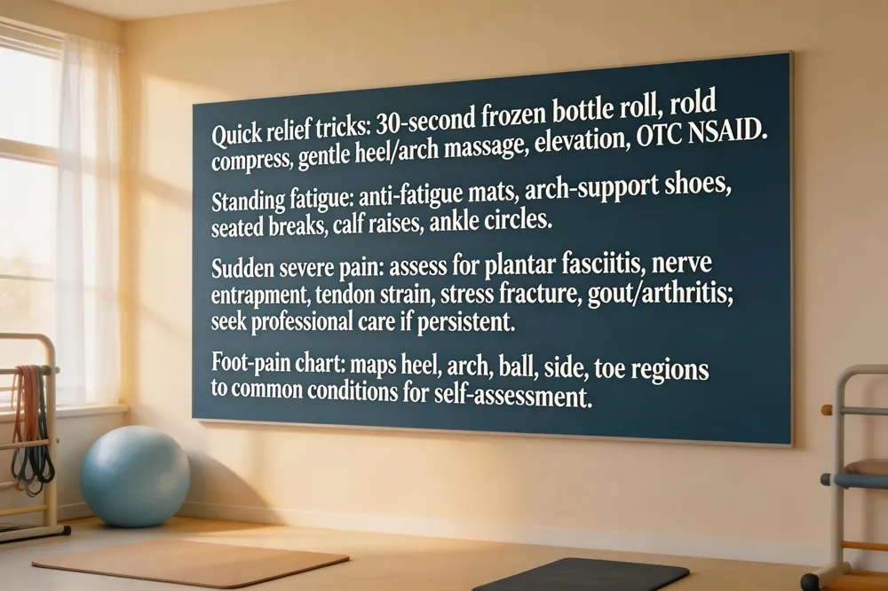Immediate pain‑relief tricks – Apply a cold compress or roll a frozen water bottle under the painful area for 30 seconds, then gently press the heel and arch with your thumbs. Elevate the foot for a few minutes and, if needed, take an OTC NSAID such as ibuprofen.