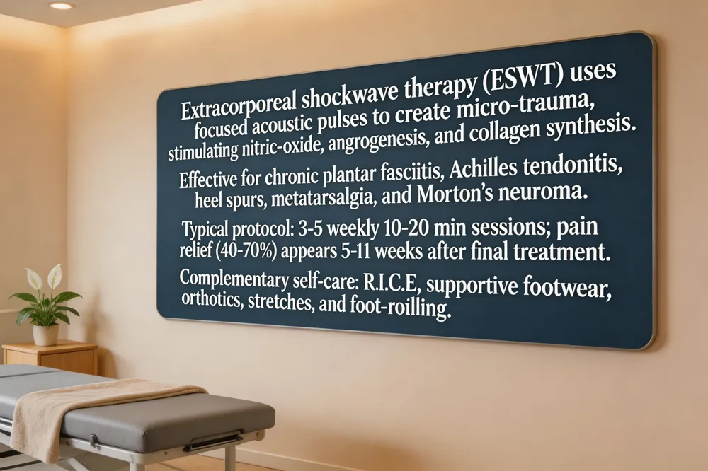 Shockwave therapy (extracorporeal shockwave therapy, ESWT) delivers focused acoustic pulses that create controlled micro‑trauma in damaged tissue. This micro‑injury triggers a cascade of cellular responses: increased nitric‑oxide production, angiogenesis, and up‑regulation of growth factors that promote collagen synthesis and tissue regeneration. Conditions that respond well to ESWT include chronic plantar fasciitis, Achilles tendonitis, heel spurs, metatarsalgia, and Morton’s neuroma. A typical protocol consists of 3‑5 weekly sessions, each 10‑20 minutes long; many patients feel an immediate “numbing” effect, but the most meaningful pain reduction (40‑70 % in 2‑4 weeks) and functional gain appear 5‑11 weeks after the final treatment. Complementary self‑care strategies—R.I.C.E. , supportive footwear, custom orthotics, calf and plantar‑fascia stretches, and gentle foot‑rolling—enhance outcomes and reduce recurrence.