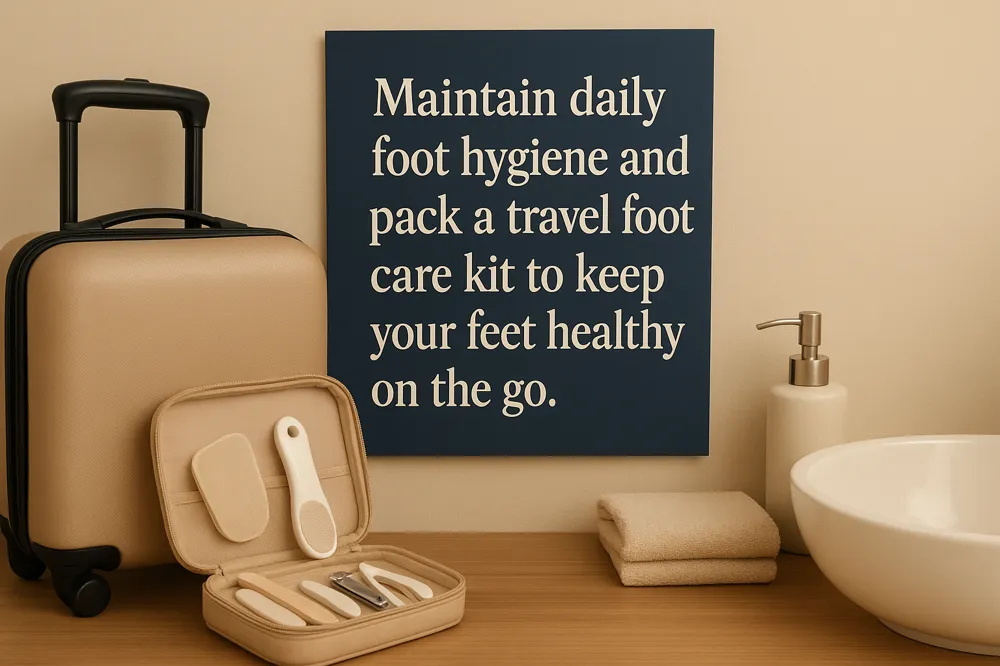 Maintaining good foot hygiene is crucial, especially while traveling. Daily washing with mild soap and thorough drying, including between the toes, prevents fungal infections such as athlete's foot. Changing into clean, moisture-wicking socks reduces the risk of skin problems and keeps feet dry. Travelers should avoid walking barefoot in public or communal areas to protect against bacteria and fungi. For more on Foot hygiene tips and prevent foot fungal infections, see expert guidance.