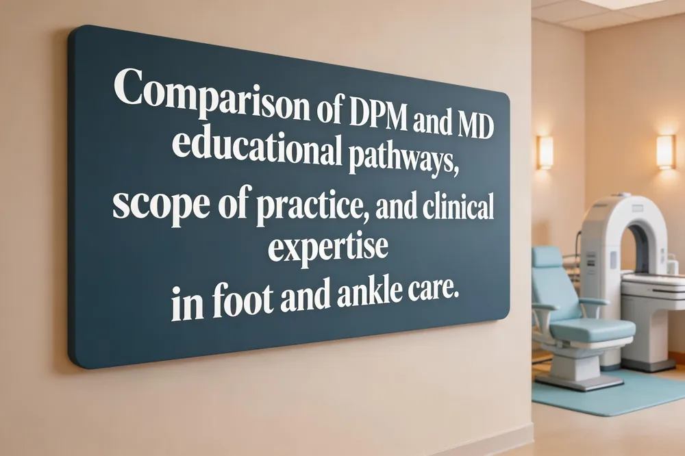 A Doctor of Podiatric Medicine (DPM) follows a distinct educational pathway from an MD. DPMs complete a four‑year podiatric medical school program, then a three‑year CPME‑approved residency focused exclusively on foot, ankle, and lower‑leg disorders, and must obtain board certification from the American Board of Podiatric Medicine (ABPM) or the American Board of Foot and Ankle Surgery (ABFAS). MDs attend a four‑year all‑medicine medical school, followed by a residency in a chosen specialty that may include general surgery, internal medicine, or orthopaedics, and they can become board‑certified in a wide range of systemic conditions. Clinically, DPMs concentrate on biomechanics, orthotics, wound care, and minimally invasive foot‑and‑ankle surgery—procedures such as percutaneous bunionectomy, EPAT shockwave therapy, and laser treatment for onychomycosis that many MDs do not perform. MDs are suited for systemic illnesses, complex multi‑system issues, and surgeries beyond the lower extremity. For persistent heel pain, bunions, diabetic foot ulcers, or ankle injuries, see a DPM; for non‑foot‑related medical concerns, consult an MD or DO.